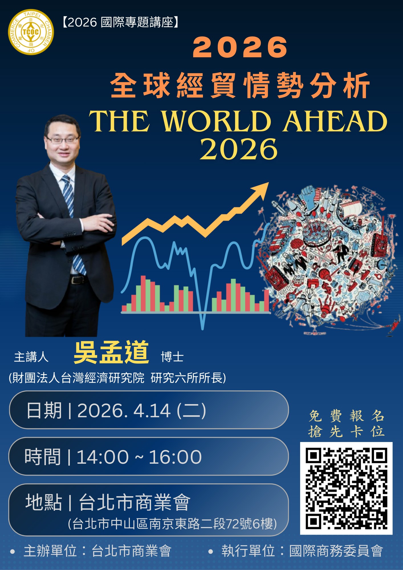 川普 2.0 時代來襲,全球供應鏈再度面臨大洗牌!2026 年,台灣企業該如何在劇烈的經貿波動中穩住腳步?我們特別邀請台灣經濟研究院所長 吳孟道博士,以最權威的數據分析,帶您直擊全球經貿核心。從美國政策走向到台灣景氣展望,2 小時濃縮全年關鍵趨勢,拆解未來不確定性的應對策略。這不只是講座,更是您佈局年度決策、趨吉避凶的關鍵指南,助您在變數中精準定位、領先佈局!